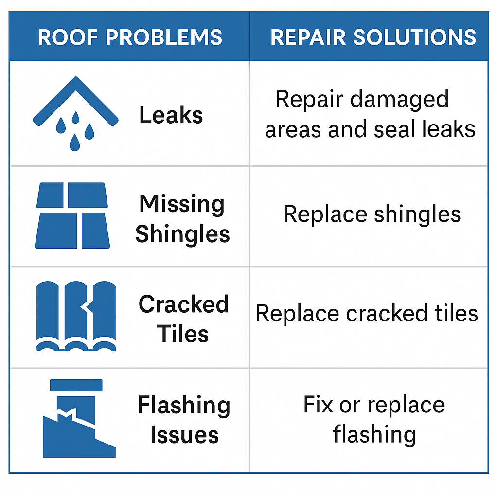 • Minor repairs: $150–$500 (a few shingles, small leaks, flashing fixes)